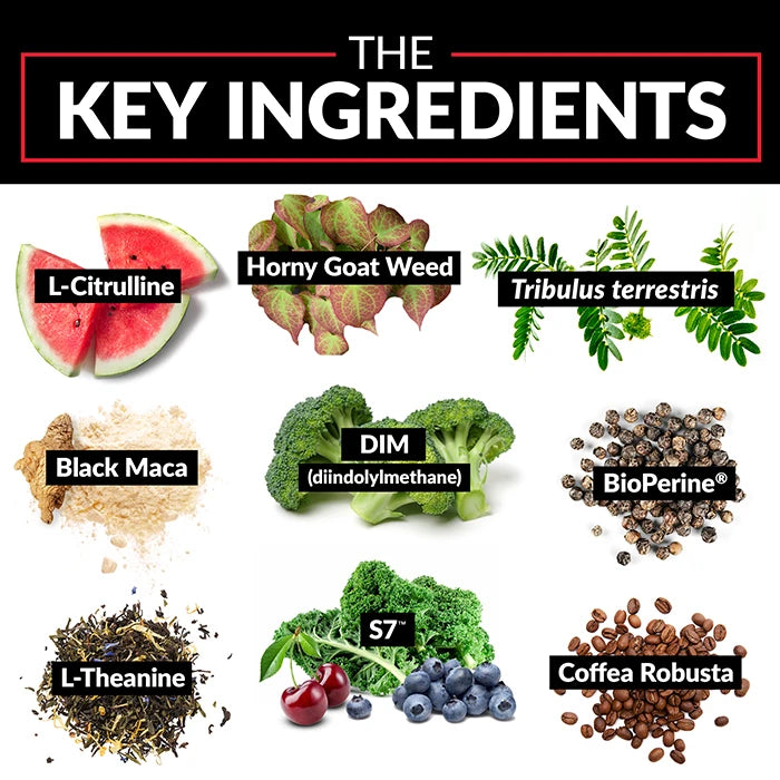 - Black maca, tribulus, gingko, cordyceps & DIM
